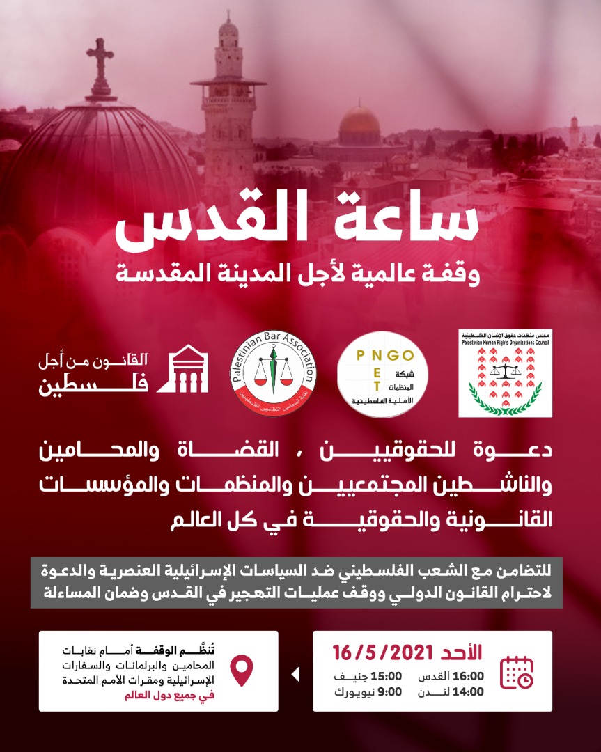 دعت أكثر من 70 منظمة حقوقية ومدنية من مختلف أنحاء العالم في بيان مشترك حقوقي العالم، والقضاة والمحامين، والناشطين المجتمعيين والمنظمات والمؤسسات القانونية والحقوقية حول العالم للمشاركة في “الوقفة العالمية لأجل المدينة المقدسة“، يوم الأحد القادم، وذلك للتعبير عن التضامن مع الشعب الفلسطيني ضد السياسات الإسرائيلية العنصرية والدعوة لاحترام القانون الدولي ووقف عمليات التهجير في القدس وضمان المساءلة، ورفضاً للعدوان الإسرائيلي على المدنيين في قطاع غزة واستهدافهم بالقوة المميتة وما يرتكب من جرائم الحرب، والتحذير من استمرار ذلك.