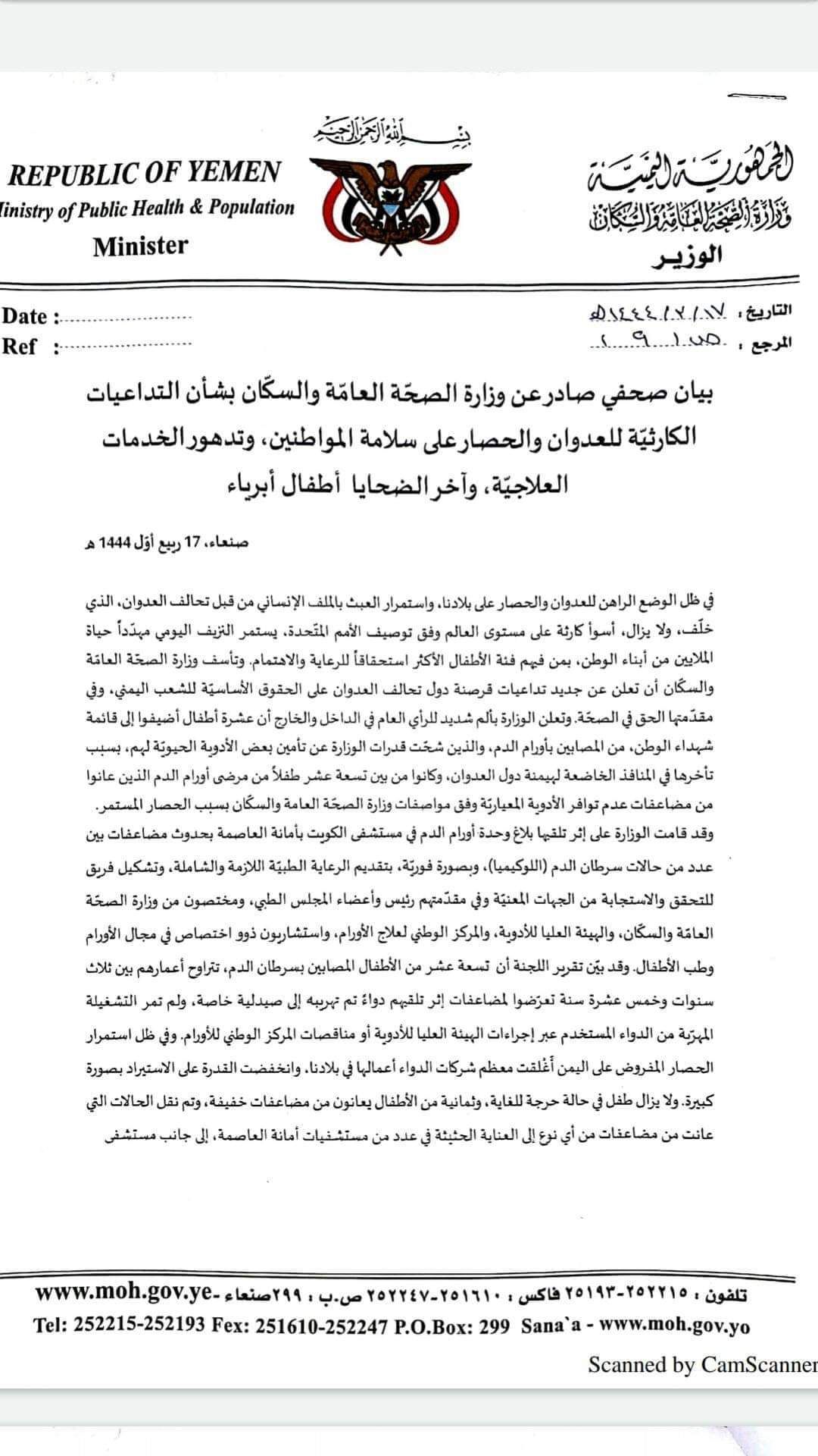 ولفتت "المنظمات " إلى أن المنظمة اليمنية لمكافحة الاتجار بالبشر، كانت قد كشفت عن وفاة عشرات الأطفال من مرضى السرطان في صنعاء أواخر شهر سبتمبر 2022. حيث أوضحت المنظمة بأن وزارة الصحة والسكان في حكومة الحوثيين قامت بصرف جرعات علاجية منتهية الصلاحية بعد أن تم تزييف تاريخ الصلاحية ما أدى إلى وفاة عشرات الأطفال المصابين بالسرطان.